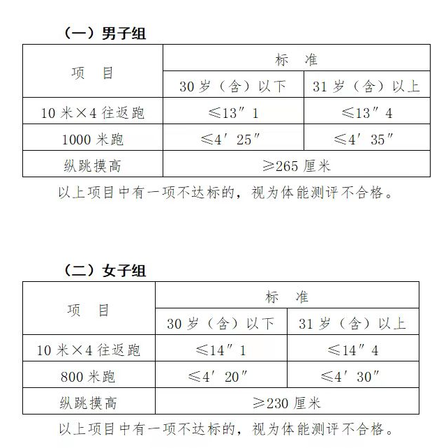 體測項目為縱跳摸高、10米×4往返跑和1000米(男)或800米(女)長跑,體能測試項目評分標準依據(jù)《公安機關錄用人民警察體能測評項目和標準(暫行)》執(zhí)行(見附件3),體能測試項目規(guī)則按照《公安機關錄用人民警察體能測評實施規(guī)則》執(zhí)行(見附件4)。