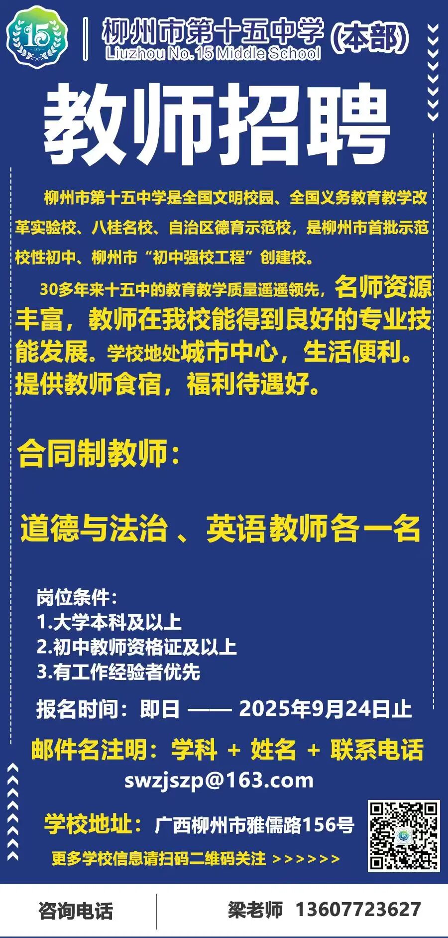 原文標(biāo)題:柳州市第十五中學(xué)本部招聘公告