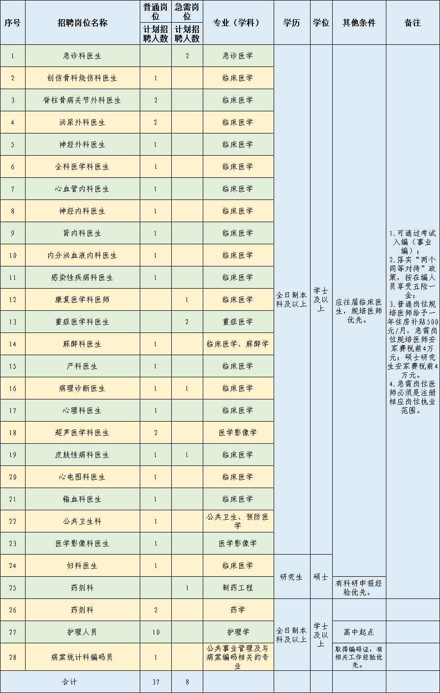 2.具有規(guī)培合格證的醫(yī)生依照國衛(wèi)辦科教發(fā)〔2021〕18號文件,落實“兩個同等對待”政策,即“面向社會招收的普通高校應(yīng)屆畢業(yè)生培訓對象培訓合格當年在醫(yī)療衛(wèi)生機構(gòu)就業(yè)的,在招聘、派遣、落戶等方面,按當年應(yīng)屆畢業(yè)生同等對待。對經(jīng)住培合格的本科學歷臨床醫(yī)師,在人員招聘、職稱晉升、崗位聘用、薪酬待遇等方面,與臨床醫(yī)學、中醫(yī)專業(yè)學位碩士研究生同等對待”。普通崗位規(guī)培醫(yī)師給予一年住房補貼500元/月,急需崗位規(guī)培醫(yī)師安家費稅前4萬元,急需崗位醫(yī)師必須注冊相應(yīng)崗位執(zhí)業(yè)范圍。