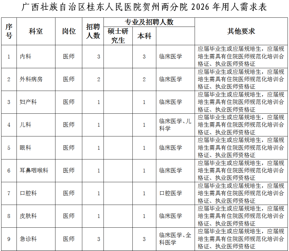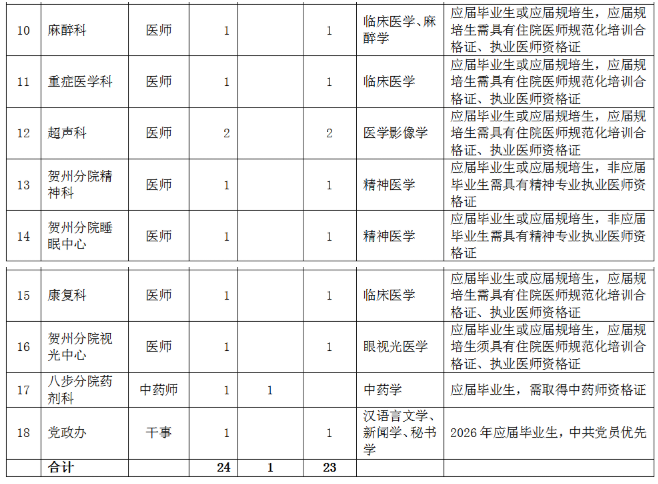 (應(yīng)聘報名二維碼)同時,按以下要求提供個人應(yīng)聘材料(電子版)發(fā)電子郵箱:gdyy2817726@163.com(郵件主題請標明:“姓名+賀州兩分院”字樣)。應(yīng)屆畢業(yè)生:個人簡歷、身份證、就業(yè)推薦表、成績單、各種獎項獎勵證書、外語等級證書等。非應(yīng)屆畢業(yè)生:個人簡歷、身份證、畢業(yè)證、畢業(yè)證備案登記表、學(xué)位證、學(xué)位證備案登記表、職稱證、執(zhí)業(yè)證、住院醫(yī)師規(guī)范化培訓(xùn)合格證、工作證明等。報名時所提交的申請材料必須真實、準確,因報名時提交的申請材料不真實、不完整或錯誤填寫報名信息,造成資格審查、面試資格審查不通過的,后果由報名人員自行承擔(dān)。(2)資格審核。人事科依據(jù)招聘公告和用人需求規(guī)定的資格條件對應(yīng)聘人員簡歷進行收集和資格初步審查,經(jīng)招聘工作領(lǐng)導(dǎo)小組審核后,確定符合崗位條件報名人員名單,由醫(yī)院人事科電話或短信通知符合條件人員。(3)考核??己斯P試和面試由人事科負責(zé)組織實施,協(xié)助部門為醫(yī)務(wù)部、護理部、科教科以及用人科室,紀律監(jiān)督部門為監(jiān)察室。逾期未參加則視為自愿放棄。(4)試工。通過考核的非應(yīng)屆畢業(yè)應(yīng)聘人員,須到醫(yī)院試工5天。試工不通過,不予聘用。(5)體檢。體檢工作由廣西壯族自治區(qū)桂東人民醫(yī)院按照有關(guān)規(guī)定統(tǒng)一組織。體檢標準參照《廣西壯族自治區(qū)事業(yè)單位公開招聘人員體檢通用標準(試行)》《廣西壯族自治區(qū)事業(yè)單位公開招聘人員體檢操作手冊(試行)》執(zhí)行。體檢不合格或隱瞞真實情況致使體檢結(jié)果失真的,不予聘用。因體檢不合格空缺崗位的,將按考核的綜合成績,從高到低,順位補充體檢人員。(6)公示和聘用。對擬聘非應(yīng)屆畢業(yè)應(yīng)聘者在全院范圍內(nèi)進行公示,公示期為5個工作日,公示期滿無異議按程序辦理聘用手續(xù)。對公示有異議,經(jīng)核實影響聘用的,取消其聘用資格;對反映問題難以核實的暫緩聘用,待核實清楚后按有關(guān)規(guī)定辦理。