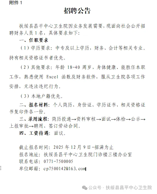 2025年崇左扶綏縣昌平中心衛(wèi)生院公開招聘財務工作人員1人