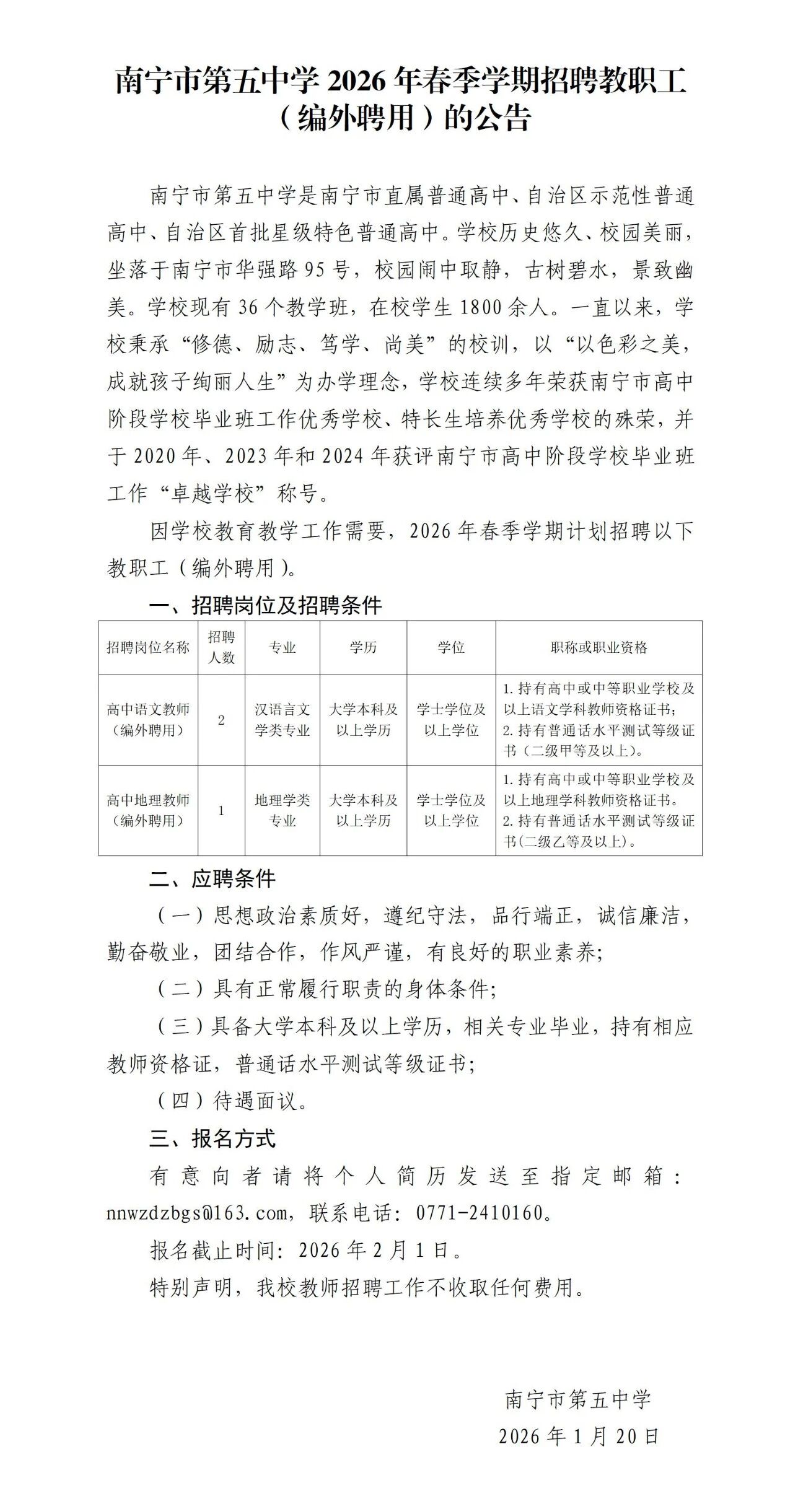 原文標題:南寧市第五中學2026年春季學期招聘教職工(編外聘用)的公告