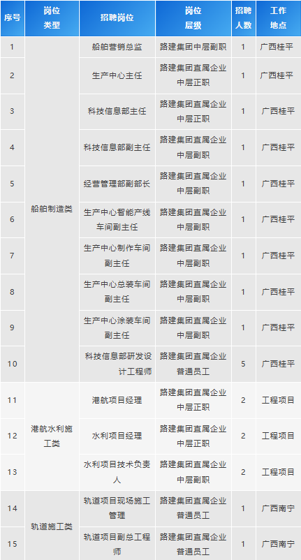 根據(jù)廣西路建集團(tuán)發(fā)展需要,現(xiàn)面向社會(huì)公開(kāi)招聘關(guān)鍵崗位人才,誠(chéng)邀有志之士與廣西路建集團(tuán)共創(chuàng)美好未來(lái)。