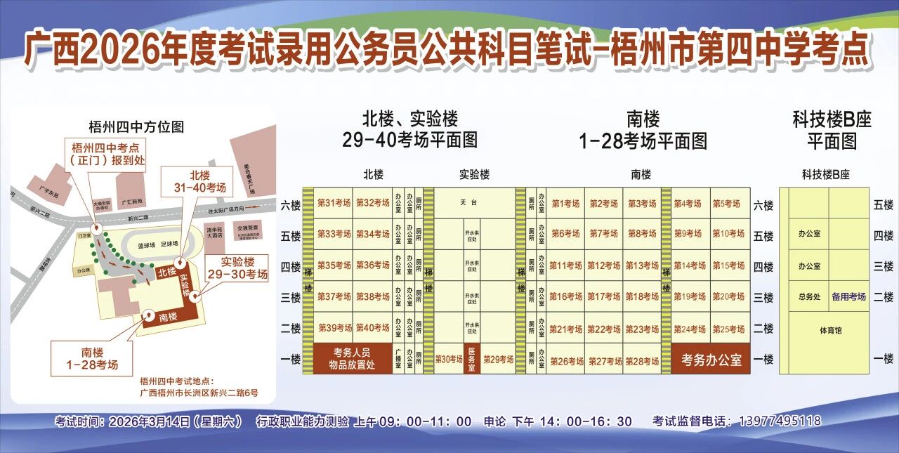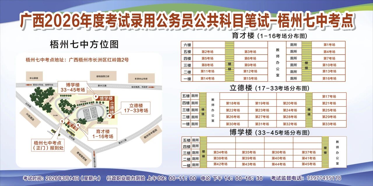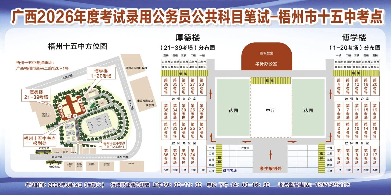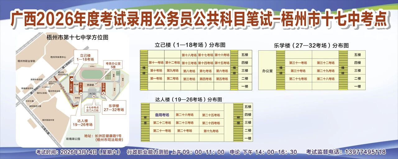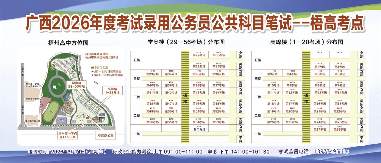 一、廣西2026年度考試錄用公務(wù)員(選調(diào)生)公共科目筆試將于3月14日舉行,梧州考區(qū)共設(shè)置10個(gè)考點(diǎn),請(qǐng)考生提前熟悉各自考點(diǎn)位置、周邊環(huán)境及交通情況,考試當(dāng)天提前出門(mén)做好準(zhǔn)備,準(zhǔn)時(shí)參加考試。