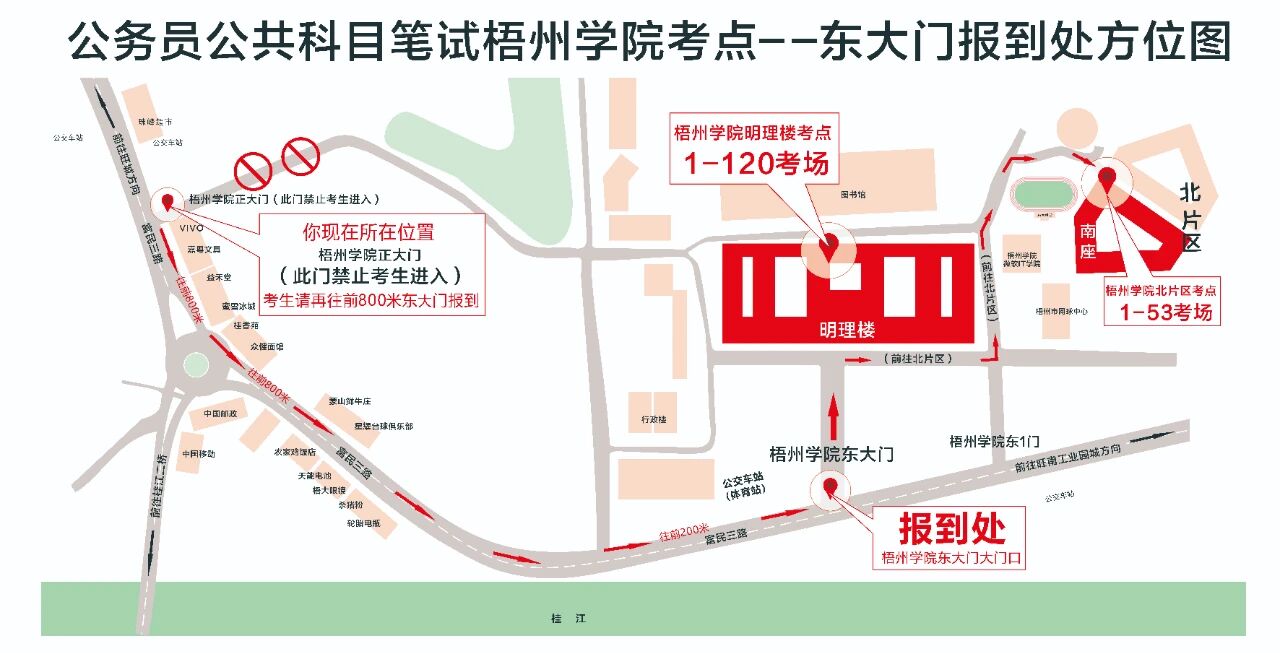 (九)梧州學(xué)院明理教學(xué)樓、梧州學(xué)院北片區(qū)(萬(wàn)秀區(qū)富民三路82號(hào))特別提醒:明理教學(xué)樓和北片區(qū)屬不同考點(diǎn),請(qǐng)考生看清楚準(zhǔn)考證,切勿走錯(cuò)考場(chǎng)。