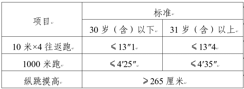 綜合管理類、執(zhí)法勤務類職位測查全部三個項目,三項全部達標方為合格;警務技術(shù)類職位免予測查1000米(男)/800米(女)跑項目,其他兩項全部達標方為合格;報考外語及少數(shù)民族語言翻譯緊缺職位的人員,體能測評三項中有兩項達標的,視為合格。
