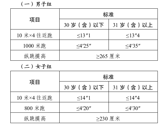 體能測評執(zhí)行中央組織部辦公廳、公安部辦公廳印發(fā)的《公安機(jī)關(guān)錄用人民警察體能測評項目和標(biāo)準(zhǔn)》(公政治〔2024〕60號)有關(guān)規(guī)定,縱跳摸高每人最多可測3次,10米×4往返跑每人最多可測2次,男子1000米(女子800米)每人最多可測1次。體能測評的項目和標(biāo)準(zhǔn)如下: